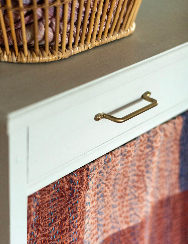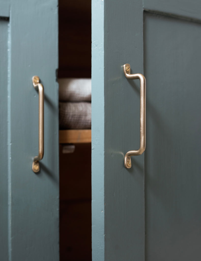 Simple, hand-made handle of warm, antiqued brass. Irregularities in finish will occur. Useful on doors and drawers. Screws are included, but it's important to know what material you are working with prior to installation. Ask your contractor or friendly hardware store associate if you are unsure as you may need different screws.