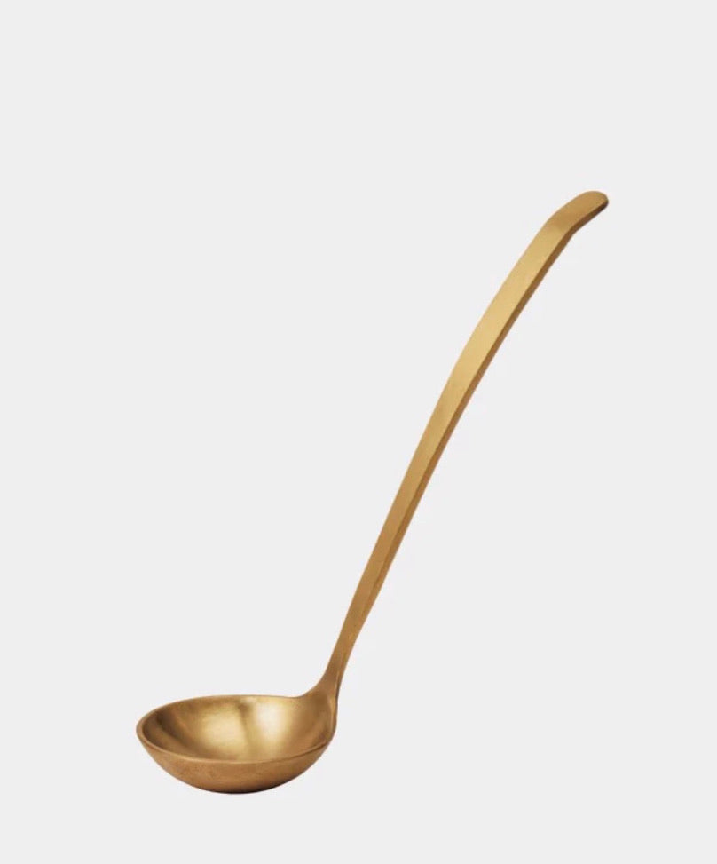 Beautiful, hand-hammered brass serving ladle with a matte finish. At home in the kitchen for scooping soups and stews and at the table for serving up that something special. Makes a  wonderful house-warming gift or a treat for your favorite cook. As each is hand-made, surfaces may not be uniform. Will patina with use.