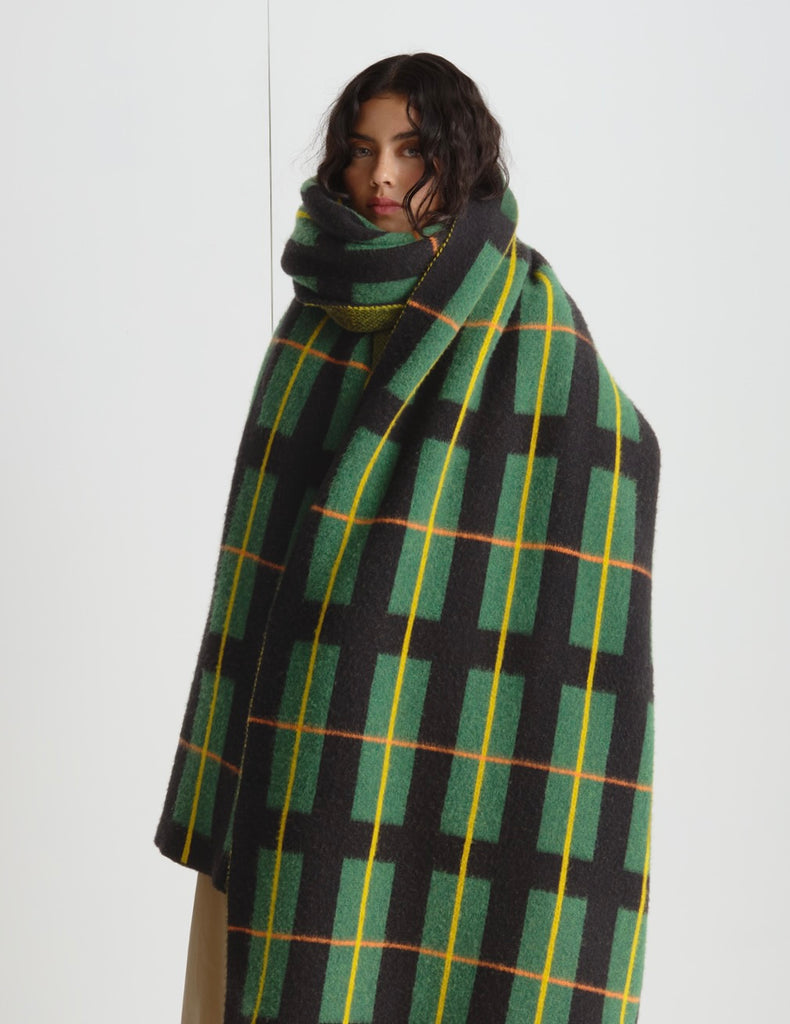 Jo's version of tartan, a huge, luxurious, and cosy scarf made from the softest brushed lambswool. Can be worn draped over the shoulders for dramatic effect or wrapped round to keep cosy. On a cold winter’s night, it is perfect for snuggling on the sofa or even in bed. Throw over your furniture for some interior pattern.