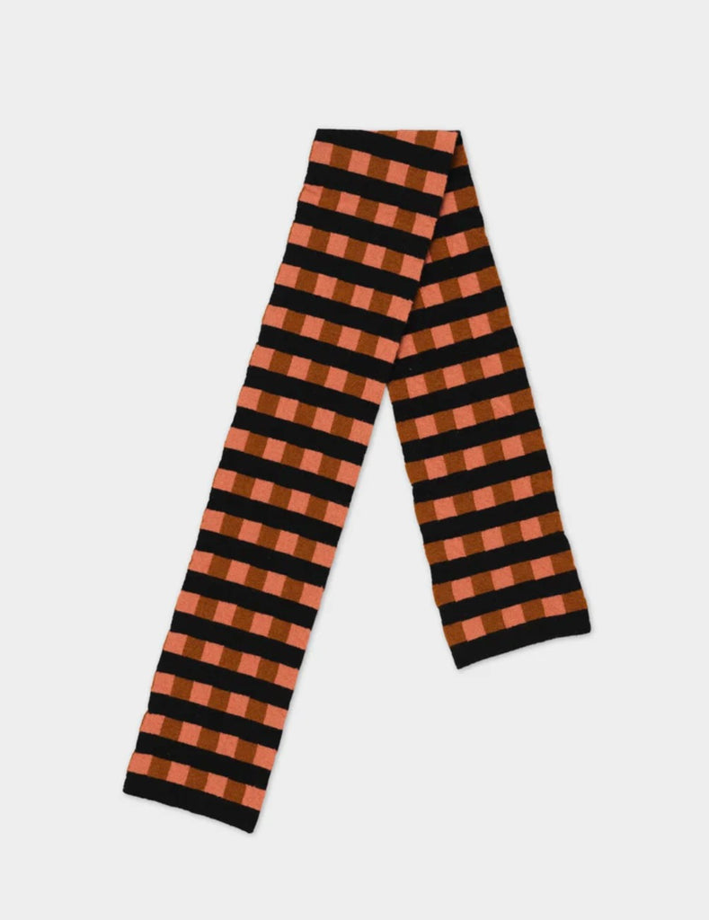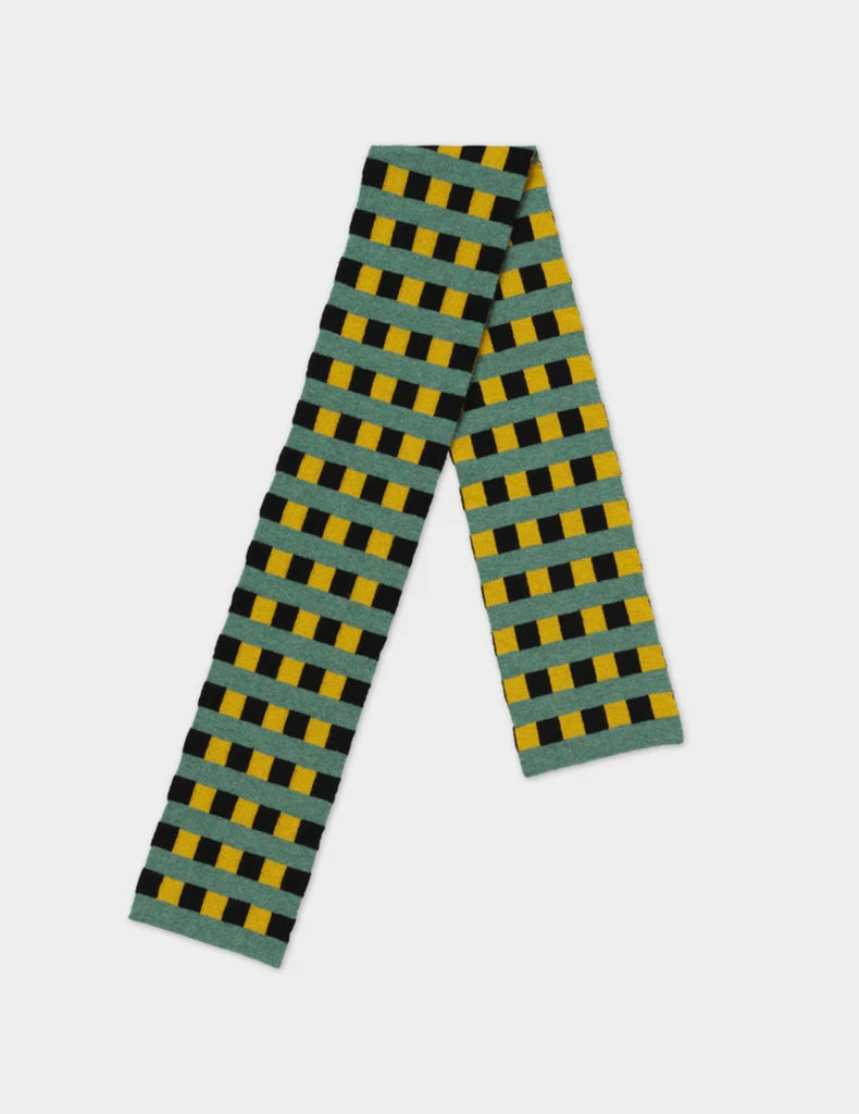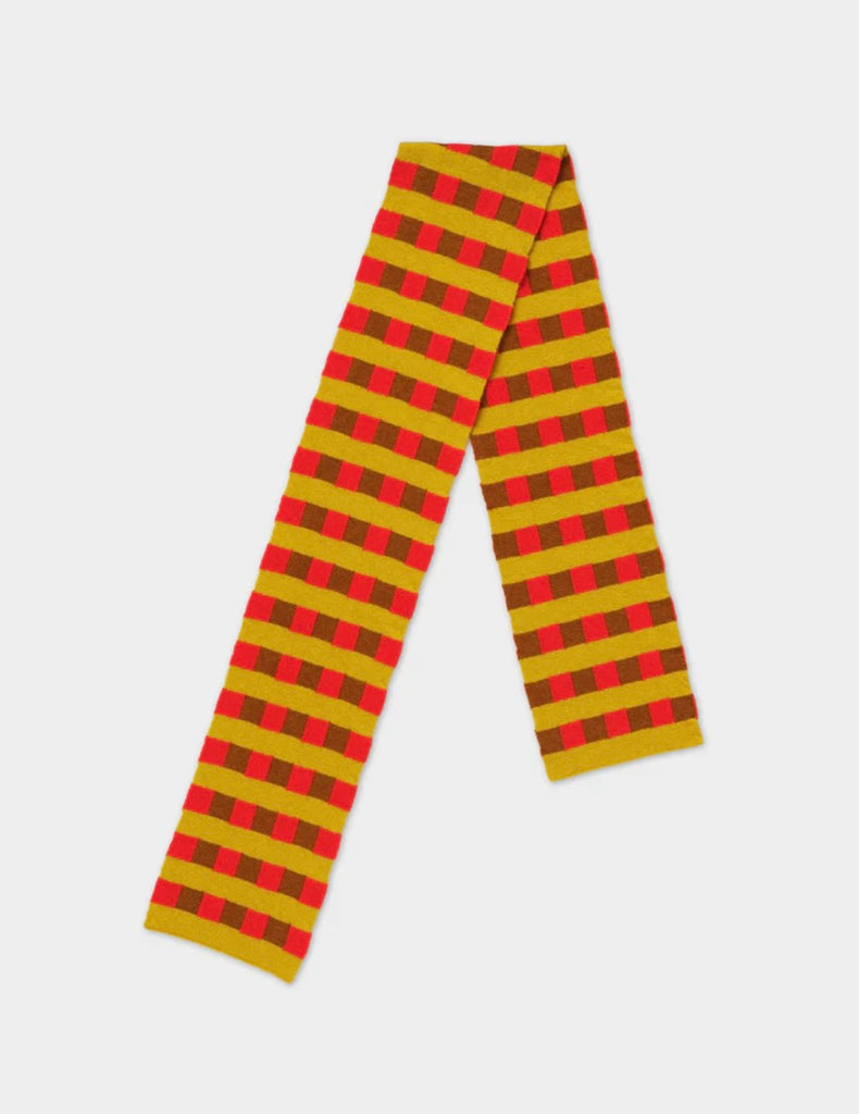 A small all-season scarf in a bright graphic pattern with a subtle waffle texture. Wear tucked into a jacket, shirt, or coat for a pop of colour. Small enough to have in your bag for chilly moments. A double layer of fine soft knit in a plain stitch.