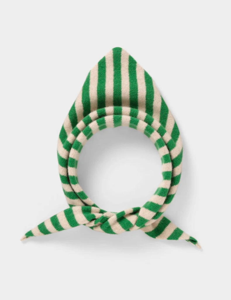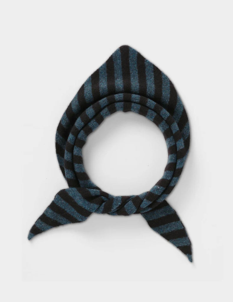 A smart and efficient brushed knit triangle shaped scarf that fits snugly around the neck without the bulk of a larger scarf. Features contrast stripes. Can also be worn as a head scarf. For any season.