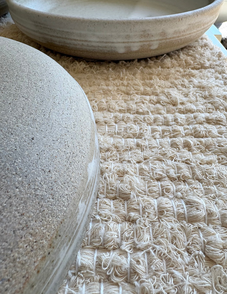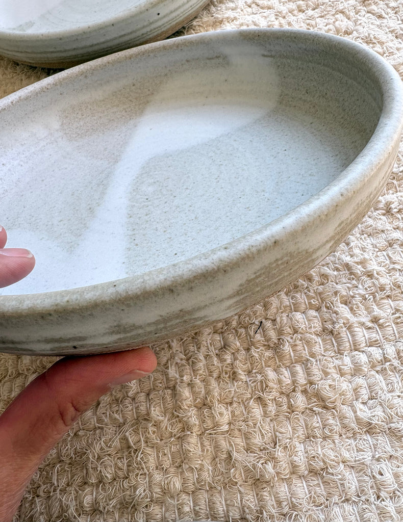 construction: stone-ware with a matte oat glaze with a swath of foggy white.