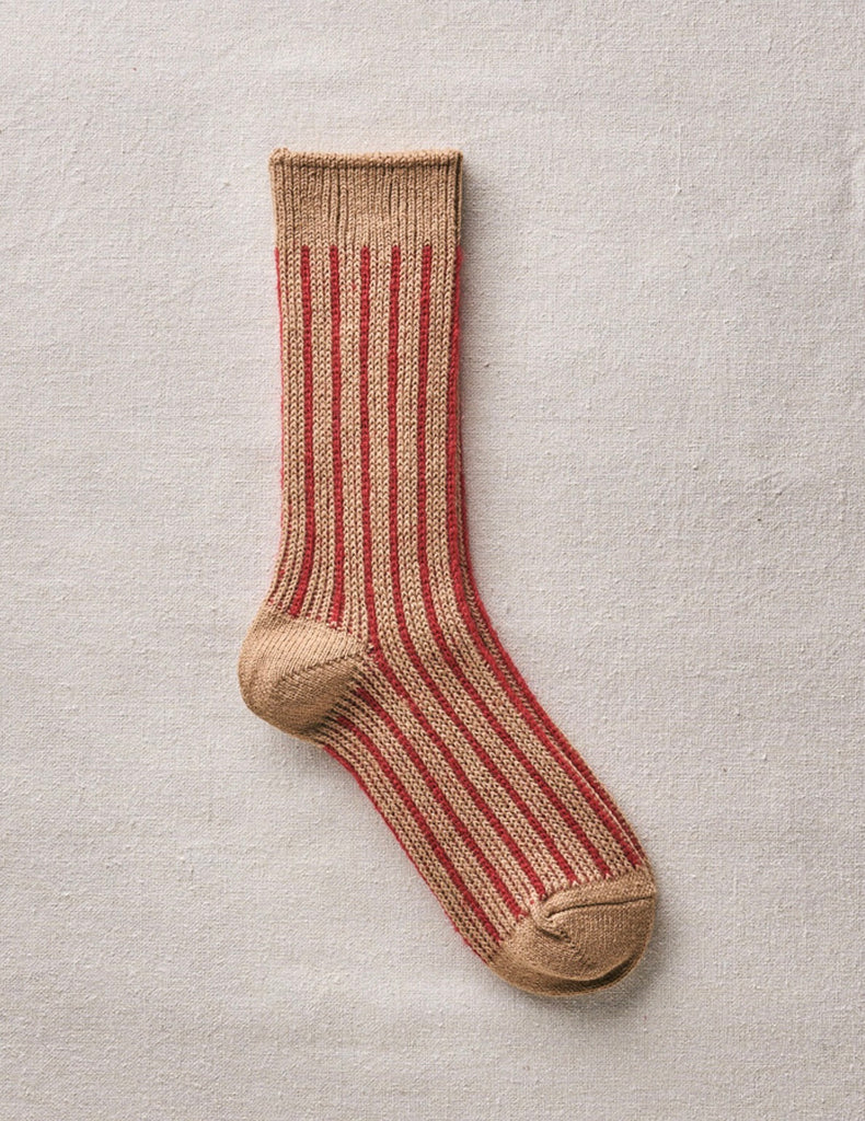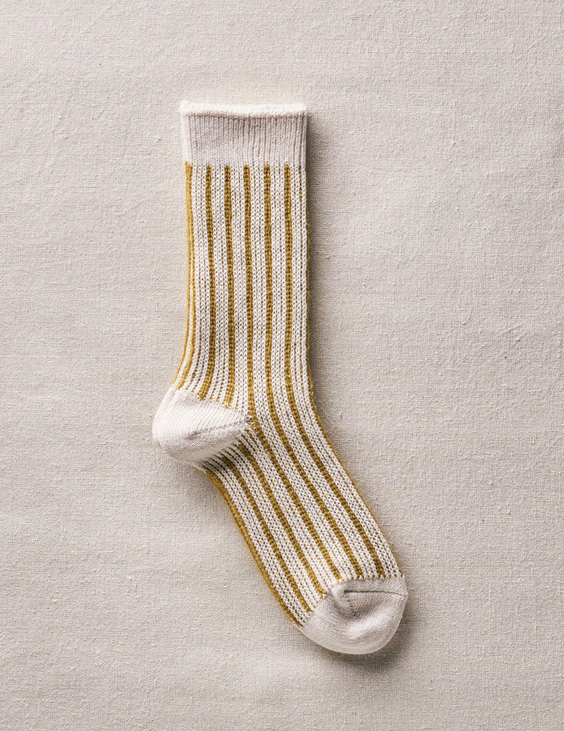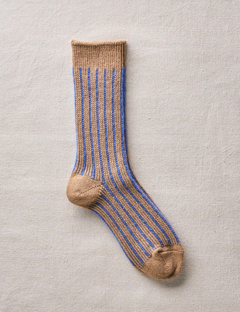 Striped low-gauge socks knitted with mohair and organic cotton. Made with kid mohair, they are soft, light and gentle on the skin. The base, heel and toe are made with thick organic cotton. Warm with beefy thickness.