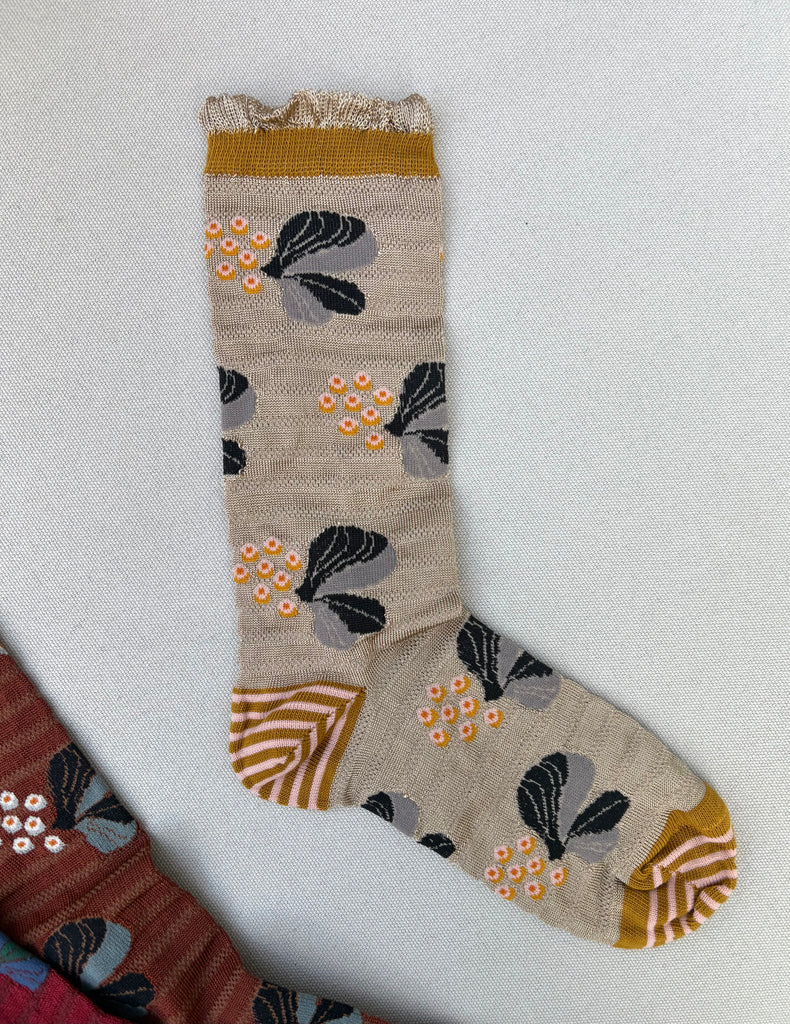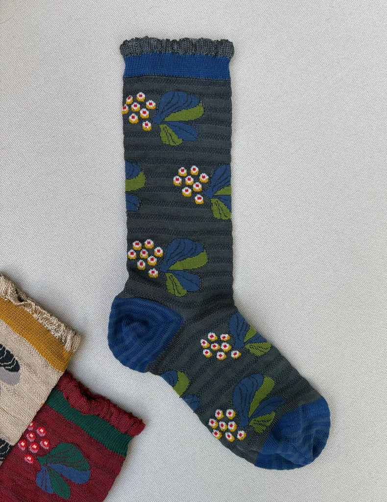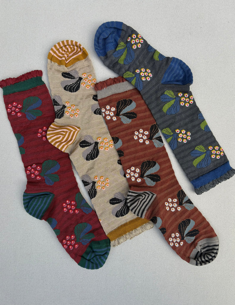 Ribbed socks featuring an art deco inspired berries/leaves design. Contrasting striped hues at the cuff, heel, and toe are handsomely paired. Comfortable band at the top with delightfully pleated trim detail. Crew length.