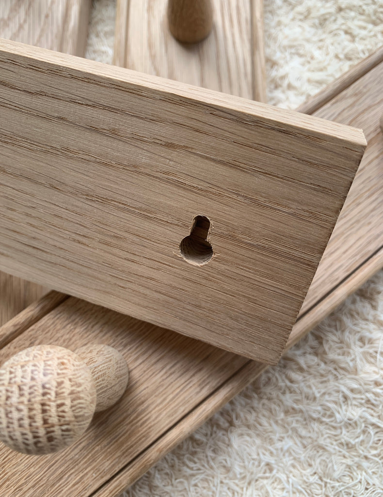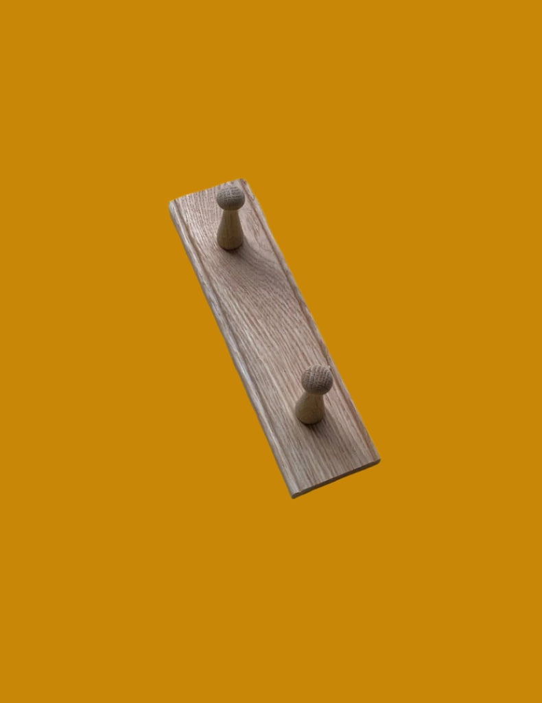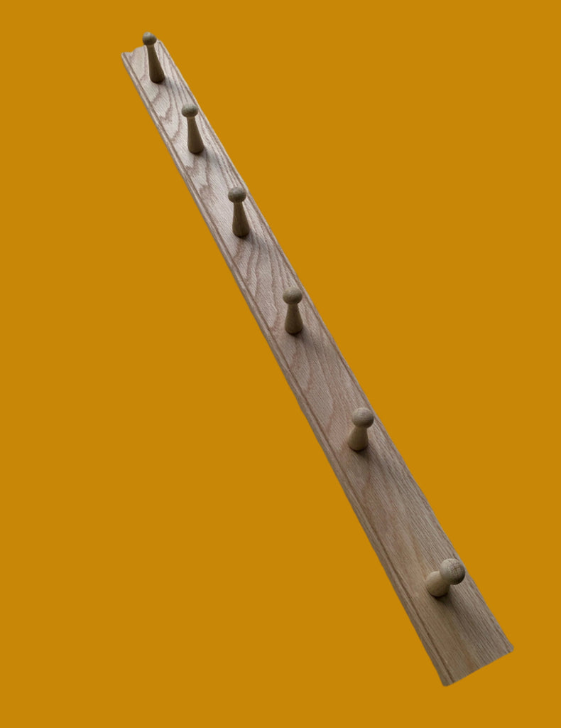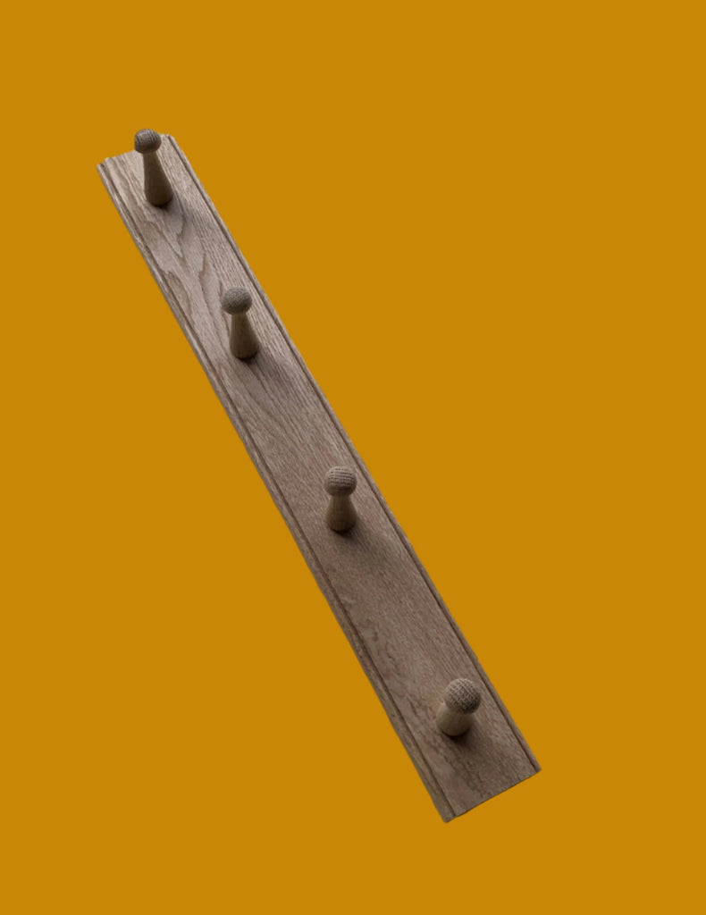 A beautifully crafted oak peg rail perfect for coats and jackets, hats and scarves, or storage of any household essentials. Pegs are landed into a solid piece of natural oak with a beaded detail top and bottom and concealed keyhole fixings on the back. While the natural wood is stunning on its own, these can be painted or stained. When mounted, the rail will protrude 3.5" off the wall. Sold individually. Mounting hardware not included.