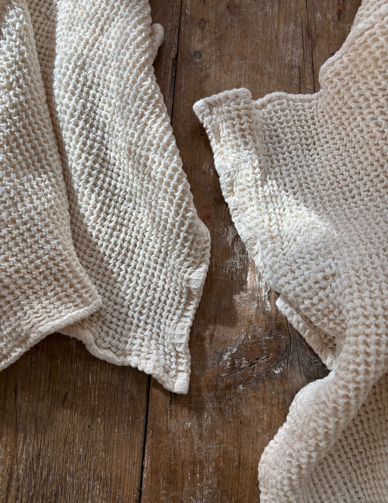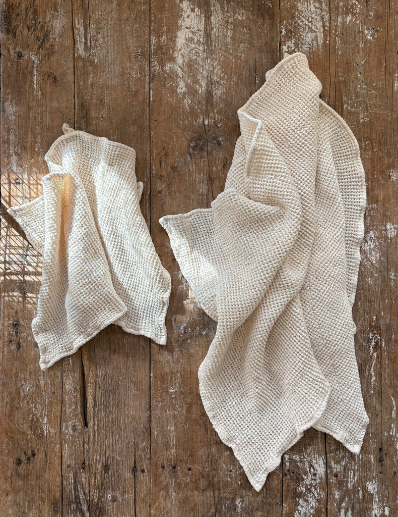 Rustic cotton towels that are soft, puckery, absorbent, and they dry fast. Plus, the waffle texture will give you a little added exfoliation leaving you bright and shiny for the day ahead. Each features a twill tape hanger loop. Bath and hand sizes offered.