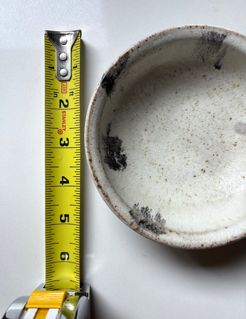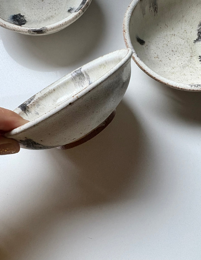 Tiny and mighty footed bowl featuring a slight rim and random 'blotches' of black glaze. You'll be reaching for this one often. Perfect for dips, jams, olives, your tinier portion of ice cream because you refuse to give that up and we don't blame you!