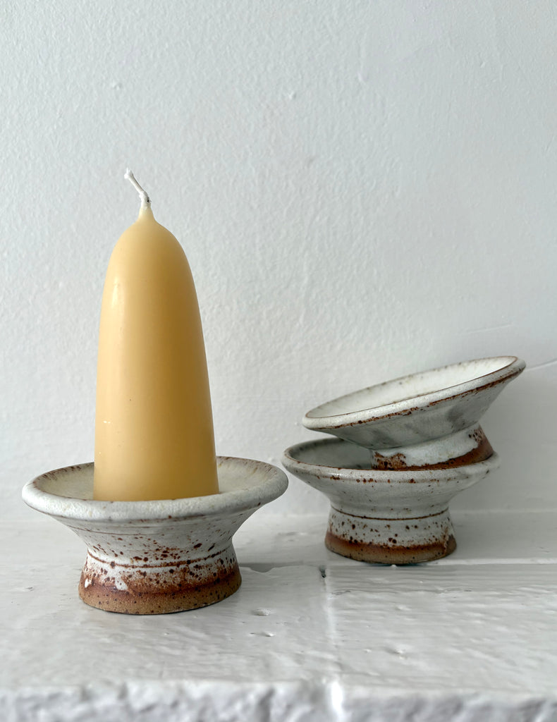 Hand-thrown, stoneware candle holder by UK potter Pip Hartle. These are designed to fit our stubby, beeswax taper candles and we suggest using something like Stick-Um to secure the base of the candle into the holder. Footed base.