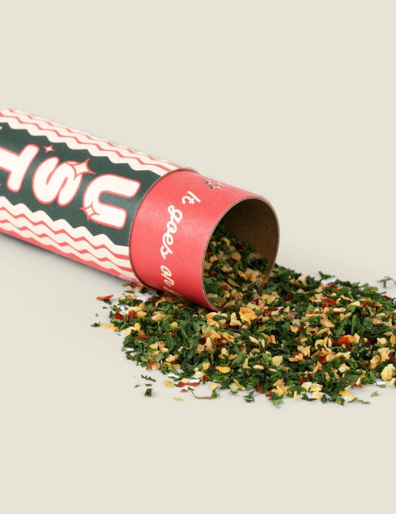 Spaghetti Dust is a ready-to-go tube of traveling Aglio, Olio e Peperoncino. The idea is that you drain your al dente pasta and toss it in a bowl with Spaghetti Dust and your favorite EVOO, then serve immediately at the table or, if it's been a late night, you consume it entirely and directly on the kitchen counter. Goes great on grilled veggies, fish, steak, pizza, and more!